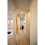 廊下との間仕切りをなくし、見せ筋交いで耐震性を確保しつつ意匠性をアップ。 この見せ筋交いにより、リビング入口からキッチンへの動線をしたうえで、開放感あふれる空間に仕上げることができました。