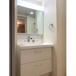 L社のピアラを設置致しました。 スライド引き出し収納になったことで以前よりも収納スペースが増えています。 また内装工事も併せて行い、明るく清潔感ある洗面所・脱衣所になりました。