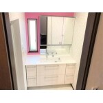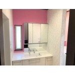 洗面台を清潔感あるホワイトにしアクセントカラーのピンクをあしらった明るい洗面所へと変貌しました。 3面鏡で収納力もよくカウンター上がスッキリとします。