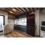 清掃面、デザイン面を加味してPanasonicのラクシーナをご提案しました。 レンジフードは、ほっとくリーンフードを選定しています。全自動のおそうじファン付きでお手入れがとても楽になりました。 また、リビングのヴィンテージモダンな雰囲気に合うよう扉柄はシックなカラーを選定しています。