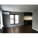ウォールナット色の床材とグレーのクロスで、落ち着いた雰囲気に生まれ変わりました。 エアコンの位置も変更して、キッチンをコの字型に広げました。