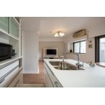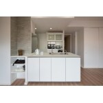キッチンの正面と側面の壁を撤去、レンジフードのみにしました。壁がなくなりリビングとの一体感を出し明るい雰囲気になりました。