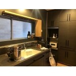 右の壁には天井までのキャビネットを設え、収納力を向上しています。窓上にも、棚を造作し、見せる収納が可能です。