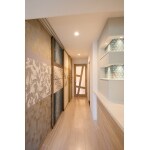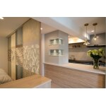 床全体をかさ上げしてバリアフリーを実現した。またリビングに寝室を取り込みリビングと寝室の境を家具で区切って解放感のある空間とした。独立キッチンからキッチン背面をオープンカウンターとし、冷蔵庫裏の壁に270度楽しめる存在感のあるニッチを施工した。