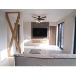 LDKに関しては白と黒をベースにしたモノトーンな雰囲気になっており、お客様のご要望が詰まっております。 テレビの裏に脱臭機能のあるエコカラット施工しており、ダウンライトを設けて雰囲気づくりも出来ております。 サッシの前には室内で干せるための物干しユニットも取り付けております。