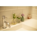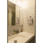 グレーと白のシックな雰囲気の空間に、サブウェイタイルを用いることで、清潔感漂いつつ素敵なアクセントになっています。 洗面台が広く明るくなり椅子も入れられるので、メイク時間も快適です。