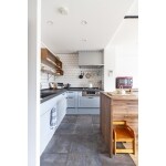海外のキッチンに憧れておられ、念願が叶った家になりました。 キッチンのタイル貼りはお客様もデザイナーも自慢の仕上がり。 淡いブルーの建具やキッチンの扉がアクセントになってお部屋の雰囲気を上品なものにしています。 アーチ型の入り口がある「かまくら」の中はお父さんとお子様のひみつきちです。 クロゼットには有孔ボードを使用し、お子さまの上着やバッグを好きな位置に引っ掛けることができ、見せる収納として活かしています。壁に取り付けた時計も存在感アリ。 シンプルでいて個性的な空間に仕上がりました。 家族みんながすぐに帰りたくなるような居心地の良い家の出来上がりです。