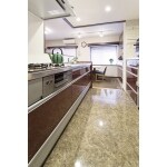 キッチンの向きを変えてリビング側に目線がいく形をご提案。さらに視界を遮る下り壁と吊戸棚も撤去することで、お料理や洗い物中でも、自然と会話が弾む空間になるようにしました。 また、キッチンから横の直線移動で、洗面・浴室まで行けるようにし、家事動線の負担を軽減できるようにしました。
