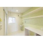 脱衣室に洗濯もできるスペースを確保されたいとの希望もあり、浴室横は洗面台は設置せず脱衣・洗濯をメインとした空間にしました。 この脱衣室には手動の物干し(ホスクリーン)を設置し 雨や梅雨時期は室内に干すこともできます。 洗面所はトイレ横に新たに新設しました。
