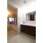 白ではなく木目の扉でメリハリをつけました。水栓とレバーが上部についている為、お手入れもしやすく清潔です。三面鏡部分は手がとどきやすい部分までになり、一番上の収納も取り出しやすいです。