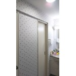配管更新のため、洗面台や洗濯水栓近くの壁を一部取外し、工事を行いました。その後、壁を修復し、洗面室のクロスを全面張り替えました。