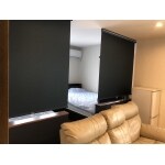 収納をなくしてしまう代わりに、広めのWICを新しく作り、寝ながらテレビが見れるようにとベッド設置部分を少し小上がりにして、腰壁とロールスクリーンで空間を分けました。
