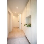 ホワイト基調の木目シューズボックスに、アイアン飾りつきの木目玄関ドアがとてもかわいらしい、明るい雰囲気の玄関です。