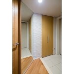 玄関廊下の斜めになった一面に鏡を施工しました。お出かけ前の身だしなみチェックだけでなく、空間に広がりが生まれました。