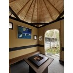 4年に渡り続いてきた、蔵~板塀~茶室・離れ改修の締め括りとして、敷地内の角に佇んでいた築年数不明の東屋をリノベーション。敷地内建物のイメージを統一すると共に、庭見と茶事に向かう待合いの場所として、シンボリックなデザインとしました。建物入り口には2本の湾曲した栗の古木を手斧で削ったものを使用し、独特な佇まいを演出。道路側の壁には、兎と兎の巣穴をイメージした型を抜き、開閉可能な障子調ワーロンプレートの小窓を通して、日中は室内に柔らかな光を届け、夜間はスポットライトにより外部に向けて、兎と満月が浮かび上がる意匠としました。