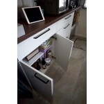 キッチン本体とはシリーズの違う木製カップボード。ゴミ箱も収納可能で、カウンターの家電スペースでは蒸気の出るものの配置を考慮し吊戸を配置しています。