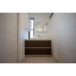 通常ですと、洗面と脱衣は一緒の場合がほとんどですが、こちらのお宅の場合、スペースに余裕があったため、ご希望通り、引き戸で仕切りました。 洗面台は窓のスペースに当たらない様に、洗面ボウルとキャビネットにして、ミラーと左側の収納は、奥様がご希望の物があるという事でしたので、それを取り付けました。