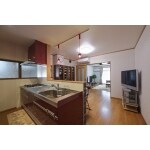 対面キッチンに変更して、前面にレンガ柄のクロスを貼りました。 お酒好きなご主人の晩酌スペースに。