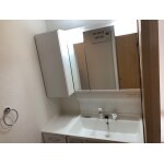 全収納の3面鏡になります。 サイドキャビネットも取付しました。 照明はLEDで曇り止めヒーターもついています。