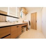 3面化粧台とカウンター下収納を増やし、いつでもすっきりとした空間になりました。 洗濯物をたたむことが出来るようユーティリティスペースとしても活用できます。