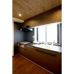 リビングや全体のおうちのテイストを崩さないよう、ダーク系の色合いで統一した、落ち着くカッコイイキッチンに仕上げました。