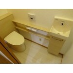 便器はパステルアイボリー、背面の収納部分やカウンターはライトウッド というお色をお選び頂きました。ウォシュレットはアプリコットF3Aタイプです。 レストパルの便器は凹凸の少ない、スッキリとした便器デザインなので、拭き掃除も簡単です。 手洗器は奥行を抑えたスリムタイプのSサイズ。 圧迫感がなく手洗器の下にはトイレットペーパーやサニタリー用品などが収納できます。 今回は自動水栓をお選び頂きました。