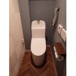 壁の一面にはエコカラットのたけひご、そのほかの壁はグレーのクロス、 床にはヘリンボーン柄のクッションフロアを施工し、雰囲気をガラリと変えました。