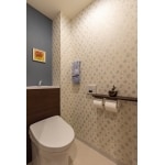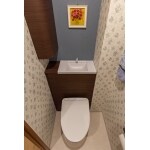 ご希望の収納型タンクトイレに交換させていただき、見た目がスッキリいたしました。 アクセントクロスをご採用いただき、華やかなトイレ空間に。 タオルかけもシンプルで目立たないものに交換し、壁紙との馴染みがよいため、トイレが非日常的な空間となりました。