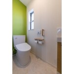 窓を小さくし、トイレを別に設けた1階のトイレ。 1、2階共アクセントクロスをグリーンにして華やかな空間に