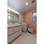 向き、位置を変えて収納スペースなども設けた洗面は広々と、淡いピンクのクロスで温かさも演出