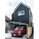 北側道路面に面した窓サイズを縮小、また数を減らしました、またファサード面のみブラックの金属サイディングを張った2トーンコーデでスタイリッシュな外観に