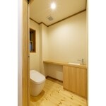 床材は足さわりの良いパイン材を使用しました。 また、タンクレストイレにすることでよりコンパクトになりました。