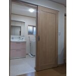 トイレは別の場所に間取り変更し、洗面所の入り口は引戸にしました。抜けない柱があったため、アウトセット引戸です。