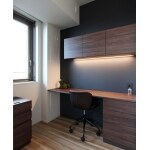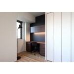 リビングから続く書斎には、TVボードとデザインを合わせたデスクを造作しました。 左側の引出しはワゴンになっており、使い方に合わせて移動できるつくりとしています。 また、幅60cmのクローゼットがありましたが、収納量を増やしたいというご要望により、幅1.2mに拡張しました。