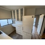 対面式でカップボードもお揃いにすることで家電収納の他、ゴミ箱の収納場所も確保し明るく広々としたキッチンになりました。
