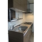 吊り戸棚、フード、ガス台、シンクを一体型のシステムキッチンに交換しました。マンションでは大きな梁が室内側に出ていますが壁を造ることでスッキリとまとめる事が出来ました。