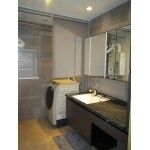 物入を撤去し洗面台の幅を150cmにしました。給湯ボイラーも交換し、洗濯機も新調しています。洗面台正面と窓側の壁にL型にエコカラットを貼っています。