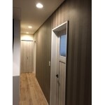 大胆なストライプ柄で廊下の奥行感を出しました。 階段も張り替えて、全体がシックな雰囲気になりました。
