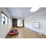 広いワンフロアで子どもがトランポリンをしたり、ハンモックでぶらさがったりノビノビ遊べる子ども部屋。将来は2部屋に区切れるように、クロゼットや窓、ドアなど2つ設置している。