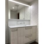 洗面台横の壁を取り除いたことによってスペースが広がり、以前よりも大きな洗面化粧台を設置することができました。 大きくなったことによって収納スペースも広がりました。 また自動水栓ときれい除菌水も備わっており、手をかざすだけで水が使え、きれい除菌水で排水口のお掃除もラクラクです。