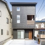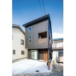 玄関ドアとインナーバルコニーのルーバー、軒天井の木目の色を合わせることにこだわり、 スタイリッシュなデザインの外観が完成。駐車スペース2台分も確保。