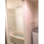 ・浴室の出入口が広くなるので、出入口の壁と床を一体感のある色合いで統一する ・正面のクロスに華やいだものを取り入れる