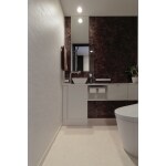 床材は耐久性、耐水性、耐薬品性にすぐれているフローリング『ハピフロア』、アクセントウォールの鏡面調石目柄に合わせて床も鏡面調石目柄(ともに大建の壁材・床材)でトータルコーディネート。 キャビネットはフローティングタイプでトイレ空間はスッキリ! サイズオーダーの鏡と石目柄のアクセントウォールの組み合わせはホテルで過ごすような贅沢な空間になりました。