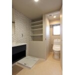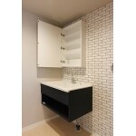 賃貸マンションでは珍しいオープンキッチンを採用して、隣の居室の間仕切りを開放すれば大空間のLDKとして使用する事ができます。“ヴィンテージカフェスタイル”をテーマに、流行のインテリアとの相性のも考慮した内装としました。 フロートタイプの洗面化粧台や、タイル柄のクロスでデザイン性高く。洗濯機横にはタオルや洗剤がたっぷり置ける収納スペースも設けました。 快適性とデザイン性を両立した、ライフスタイル提案型のリフォームをすることで、新たな入居者層への訴求と共に、入居率の改善に繋げていただける事と思います。