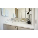 面台スペースと脱衣所に分けて、それぞれのスペースを広く確保できるようにプランニングしました。面台スペースには、椅子が収納できるタカラのホーロー製洗面化粧台(幅120cm)を採用し、椅子に座ってゆっくり髪を乾かしたり歯を磨いたりすることが出来るようになりました。