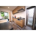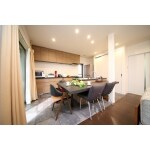 扉が3枚連動して大きく開閉ができるパントリーに加え、壁一面のカップボードをご提案しました。 食卓の天板はパナソニックのLクラスキッチンと統一感のあるデザインでオーダー作成させて頂きました。