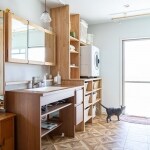 洗面所はお風呂とともに移動してスペースを確保。家族それぞれの着替えが置ける収納棚も、洗面台や奥様のドレッサーを置くスペースを考慮して造作しました。
