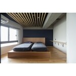 ご夫婦が足しげく通う、お気に入りの旅館。 その落ち着く雰囲気を住まいにうまく取り入れたいという、お施主様のご要望を伺うところから リノベーションが始まりました。 旅館に使用されている商材や照明、色を参考にし、 お二人が好きな木やモルタルの材質を取り入れることで、 ホテルライクでありながら、あたたかな印象に。 大がかりな間取り変更はせず、各スペースを広く取って、 のんびりとすごしやすい空間になりました。 キッチン壁の一部はモルタルを使い、天板には古材の木製カウンターを組合せたもの。 存在感のあるリビングドアは、木の素材を活かして造作したオリジナルの建具です。 脱衣洗面室の床材には、旅館のような畳風フロアタイルをセレクト。 本物のような質感でありながら、水にも強い耐久性を兼ね備えているので毎日のお手入れもお手軽です。 寝室のベッドは大工さんが旅館風に造作したもの。 ベッドに寝転がると、天井に取り付けた杉のスリット格子が心を癒してくれます。 玄関側の洋室は仕切りを作らず、旦那様の仕事部屋に生まれ変わりました。 玄関ドアを開けた瞬間に、圧迫感のない快適な空間が広がります。