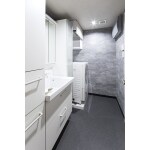 浴室と合わせて洗面室もリフォームしました。洗面台の上をスッキリさせるため、洗面台のサイズを狭め、左右に高さのある収納をご提案しました。洗濯機の上にも収納を設置。収納不足が解決し、家事がしやすくなりました。浴室と合わせて高級感のある内装にし、床はフロアタイルにしました。洗面台と洗濯機パンの奥行きをそろえたことで、通路がすっきりしました。広くて段差のない通路にしたので、バリアフリーの面でも将来安心です。