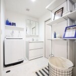 洗面台の交換と一緒に、洗濯機水栓と洗濯機パンも交換しました。クローゼットともつながるドアを設け、お出かけの支度もスムーズです。